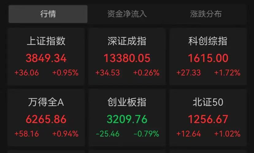 3月24日,A股市集早盘探底回升,主要指数进展存所分化。截止午间收盘,上证指数报3849.34点,高涨0.95%;深证成指报13380.05点,高涨0.26%;创业板指报3209.76点,跌0.79%;科创综指报1615.00点,高涨1.72%。