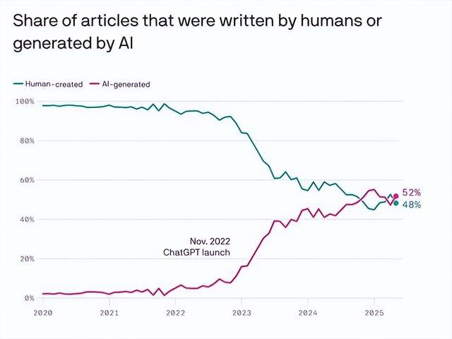网罗征询公司Graphite发布的最新看望限度清楚,现时互联网上,AI生成推行的畛域也曾持重越过东说念主类原创推行。这一限度,也让行业长期担忧的风险变得愈发要紧。